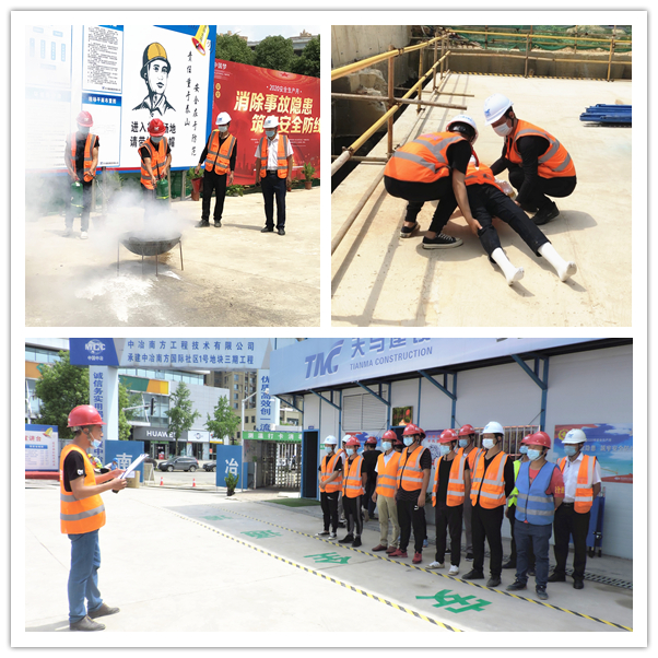 在啟動儀式結(jié)束后,由中冶南方國際社區(qū)項(xiàng)目安全主管徐國良進(jìn)行安全生產(chǎn)月教育培訓(xùn)宣講,并開展施工現(xiàn)場高處墜落應(yīng)急救援演練,模擬火災(zāi)狀況并講解防火常識及滅火器材的使用,以及模擬突發(fā)受傷狀況并講解救援常識及注意事項(xiàng)。