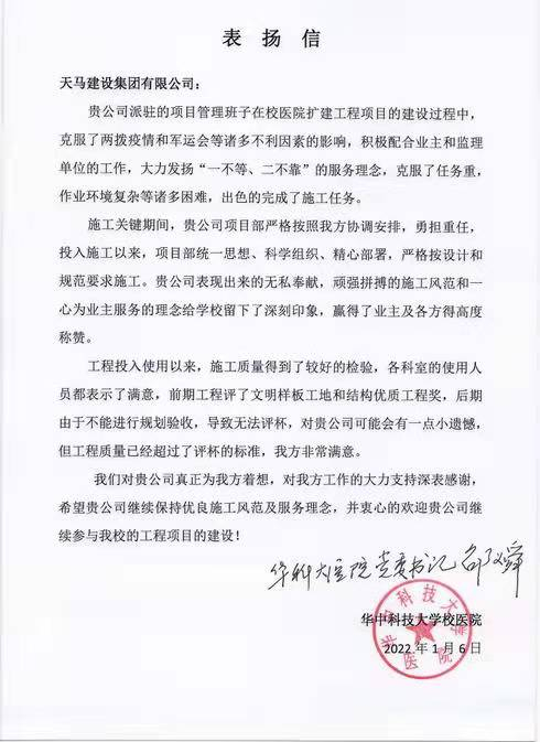 凡是過往,皆為序章。感謝華中科技大學(xué)校醫(yī)院方對(duì)天馬建設(shè)集團(tuán)有限公司的支持和認(rèn)可,一封表揚(yáng)信是認(rèn)可更是繼續(xù)前行的動(dòng)力。在今后工作中,公司將繼續(xù)秉承“逢建必優(yōu)”的宗旨,發(fā)揚(yáng)嚴(yán)謹(jǐn)務(wù)實(shí)的工作作風(fēng),加強(qiáng)細(xì)節(jié)管控,全力推進(jìn)工程項(xiàng)目,低風(fēng)險(xiǎn)、高標(biāo)準(zhǔn)、高質(zhì)量、高服務(wù)的意識(shí),積極完成業(yè)主及公司的各項(xiàng)工作指標(biāo)。