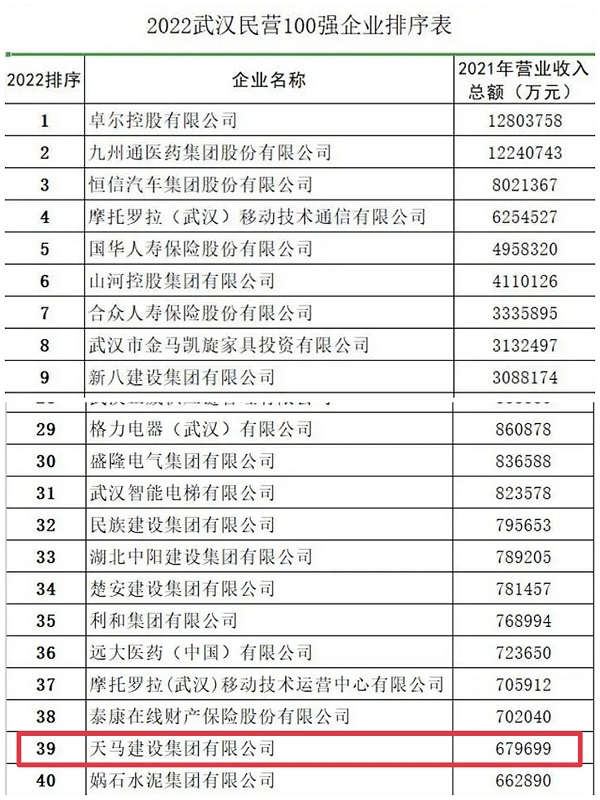 8月19日,武漢發(fā)布“2022武漢民營(yíng)企業(yè)100強(qiáng)”和“2022武漢民營(yíng)制造業(yè)企業(yè)50強(qiáng)”排序榜。天馬建設(shè)集團(tuán)位列民營(yíng)企業(yè)第39名,排名較之前上升6位。